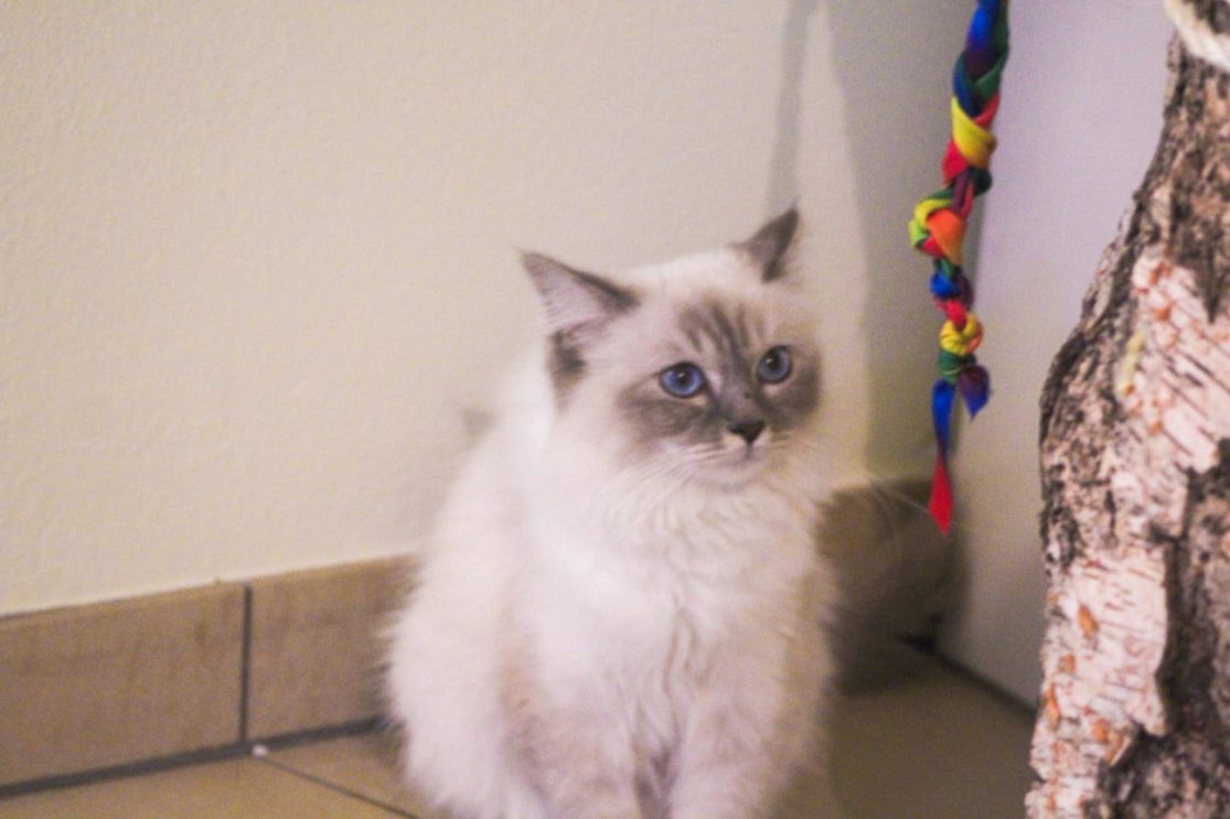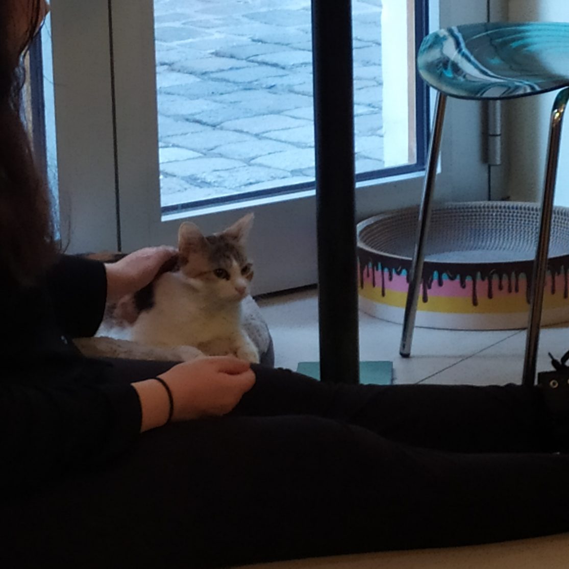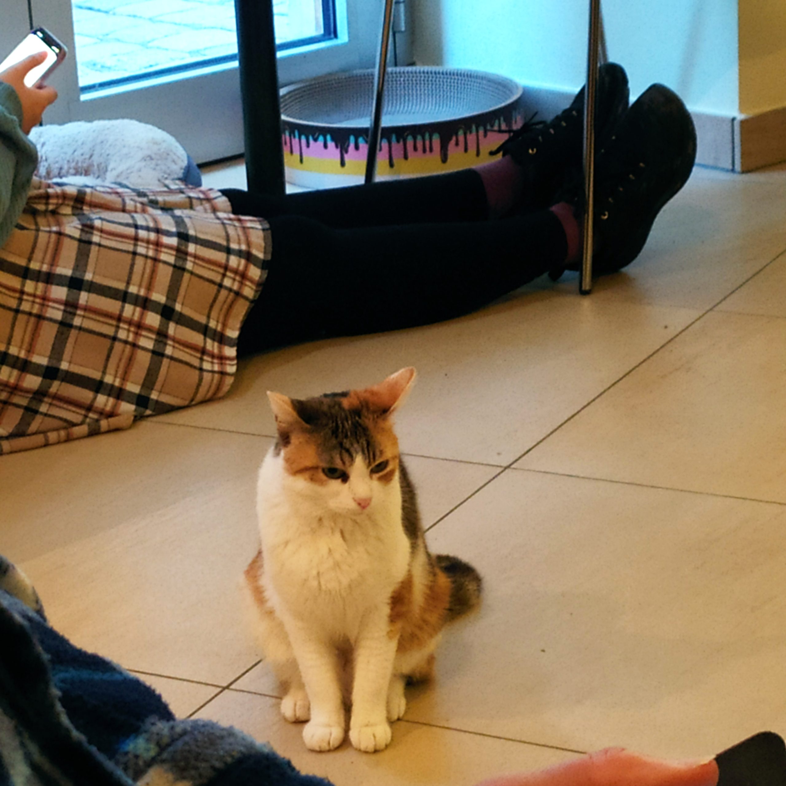 Es gibt dort 5 Katzen, viele von ihnen haben geschlafen. Eine Katze ist auf den Markus gesprungen und er hat sie dann gestreichelt.