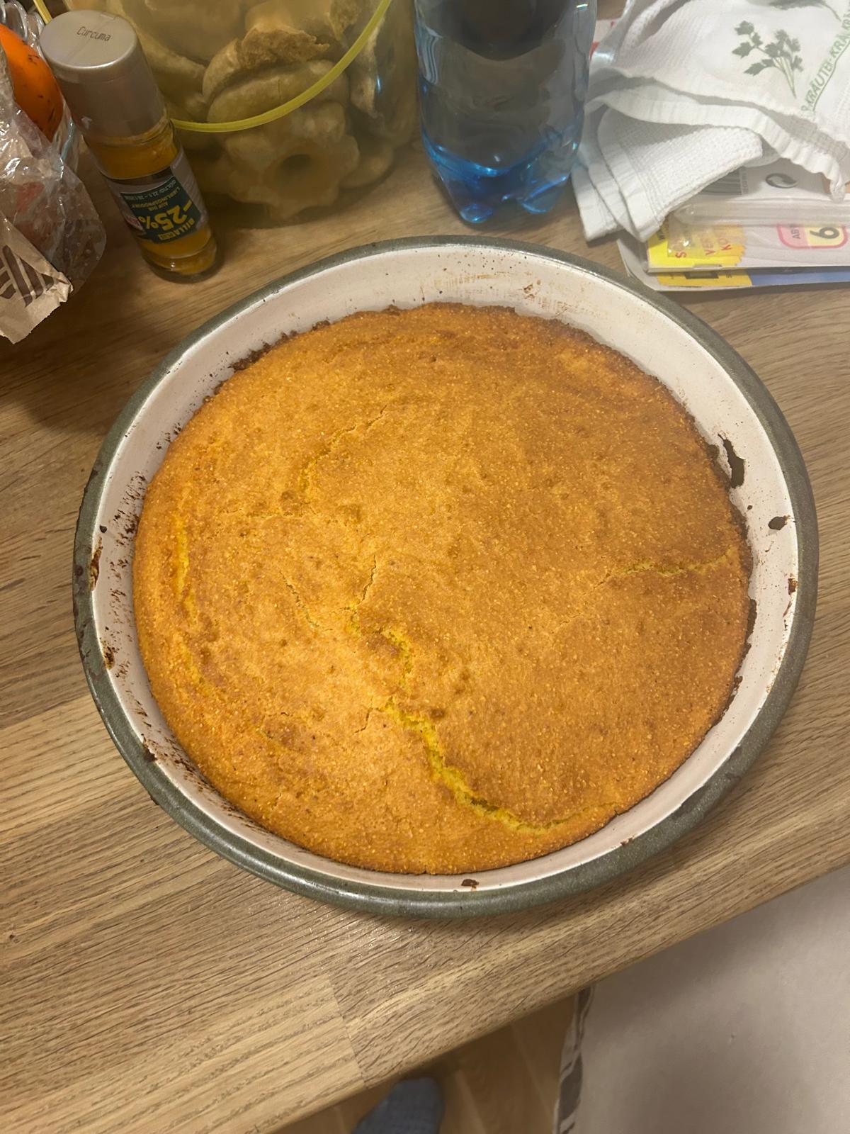 Die ganzen Zutaten in ein rundes Gefäß reingeben und dann alles mit der Hand vermischen. Dann in eine runde Backform geben. Die Form zuerst mit Öl bestreichen. Das Maisbrot bei 200 Grad im Backofen backen.